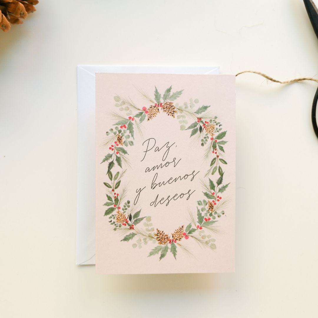 Una corona navideña en forma de tarjeta para los buenos deseos de estas fiestas de Navidad.